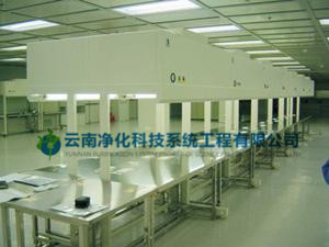 (1) 洁净隧道(Clean Tunnel):以HEPA或ULPA过滤器将制程区域或工作区域100%覆盖使洁净度等级提高至10级以上,可节省安装运转费用。此型式需将作业人员之工作区与产品和机器维修予以隔离,以避免机器维修时影响了工作及品质,ULSI制程大都采用此种型式。洁净隧道另有二项优点:A.弹性扩充容易; B.维修设备时可在维修区轻易执行。